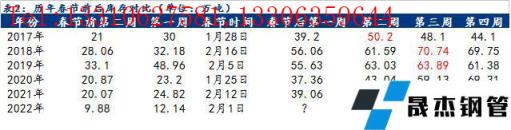 截至1月24日,貴陽建築鋼材庫存11.9萬噸,節前第二周庫存為9.88萬噸,較往年同期減少10.19萬噸,降幅達50.77%,據商家反饋,今年冬儲沒有做的原因:一是無縫鋼管廠政策沒往年有吸引力,二是對春節後需求不看好,三是市場實在是沒有資源。據曆史數據來看,2017年以來,貴陽建材庫存峰值大多是在第三周左右出現(除2020年受公共突發衛生事件影響峰值出現在第六周),峰值平均值在63萬噸,平均累庫值在31萬噸。考慮到當前貴州本地無縫鋼管廠及周邊區域無縫鋼管廠生產節奏,參考往年數據,預計春節後貴陽建材庫存峰值在32萬噸,大概率出現在第三周,節後累庫值在18-20萬噸。