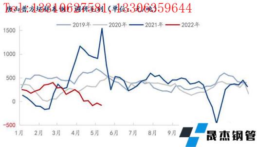 鋼坯盈利情況:本周唐山地區主流樣本無縫蜜桃视频成人APP鋼管廠家平均鐵水不含稅成本為3665元/噸,平均鋼坯含稅成本4721元/噸,周環比下調105元/噸,與5月14日普方坯出廠價格4660元/噸相比,無縫蜜桃视频成人APP鋼管廠家平均毛利潤-61元/噸,周環比下調45元/噸。